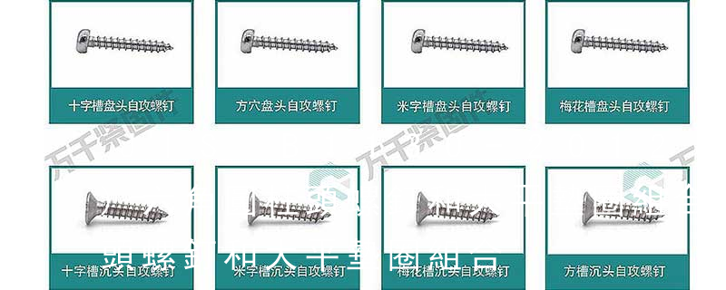 1.機螺釘 2.自攻螺釘 3.鉆尾螺釘 4.墻板釘 5.纖維板釘 6.木螺釘7.六角木螺釘 8.不脫出螺釘 9.組合螺釘 10.微型螺釘 11.家具螺釘 12.電子螺釘頭型:1.六角頭(hexagon head) 2.六角頭法蘭面(hexagon head with flange) 3.