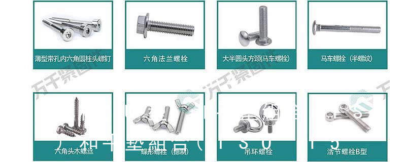螺栓類:外六角螺栓、外六角法蘭面螺栓、內六角圓柱頭螺栓、吊環螺栓、膨脹螺栓、沉頭內六角螺栓、盤頭內六角螺絲、馬車螺栓、雙頭螺栓、蝶型螺絲、活節螺栓、地腳螺 栓、U型螺栓、四角螺栓等 螺帽類:鉚螺母、吊環螺母、